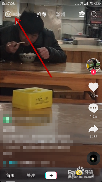 先打开随拍界面,点击抖音左上角的【随拍】,如图所示。