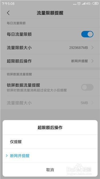 除了可以设置限额的大小之外,还可以进行超限后的操作,好比提醒或者断网。