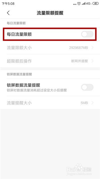然后在流量限额提醒中点击打开【每日流量限额】功能。