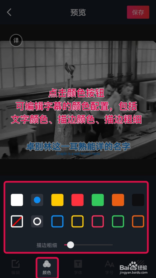 若是你感觉字幕颜色不敷都雅,那么点击「颜色」按钮,轻松设置你想要的文字颜色和文字描边