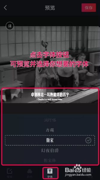 当然,你也可以字幕字体进行设置,点击「字体」按钮,上下滑动字体选择栏,可选择你喜好的文字字体。