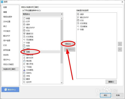 在“选项”对话框中的左侧“常用号令”中选择需要的号令后,单击“添加”