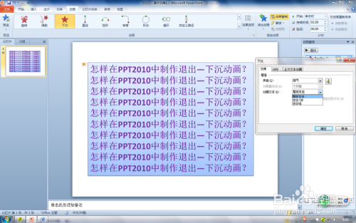 第六步:在弹出的“下沉”对话框中单击“加强”中“声音”按钮后的下拉箭头,选择一种声音结果,单击“确定”。也可以进一步设置“动画文本”。