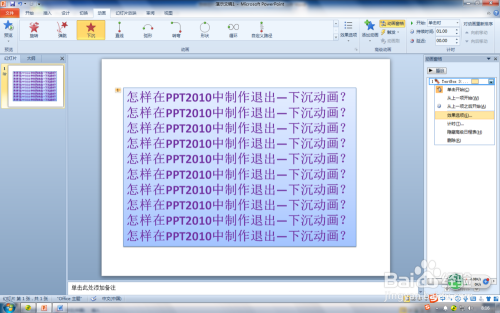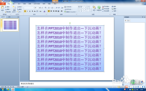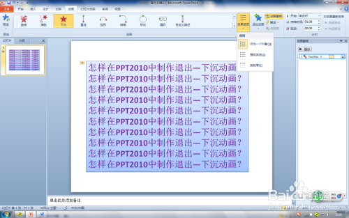 第一步:在PPT2010打开PPT文件,选摘要设置退出-下沉动画对象,这里选中输入文字添加填充色的文本框。