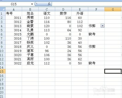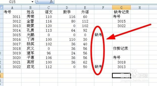 将成果筛选出来后,在后面的单位格加上“缺考”的备注