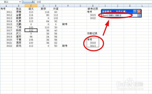 在“高级筛选”对话框中,找到“前提区域”后面的选择项单击,先勾选“缺考记实”