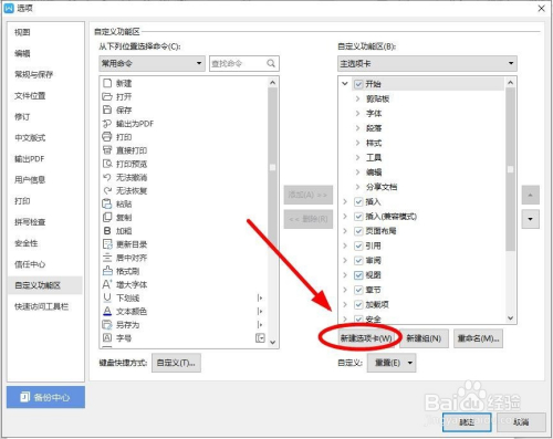 选中“新建选项卡(自界说)”后单击“重定名”