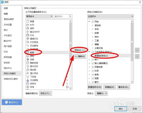 选中“新建组(自界说)”后,就把本身需要的号令按钮(这里选中“粘贴”号令)在左侧选中后,单击“添加”即可添加到新的选项卡中