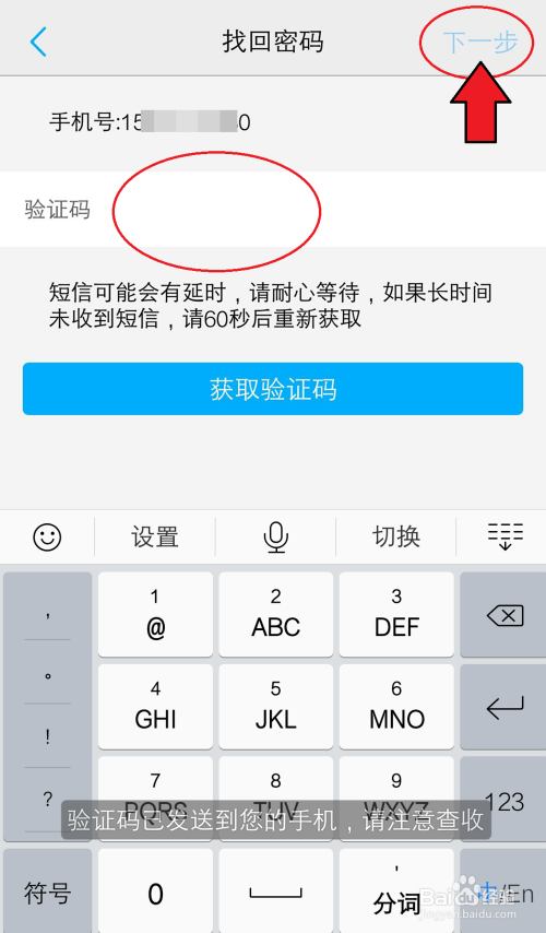 手机/邮箱会收到验证码,输入验证码,再点击【下一步】。