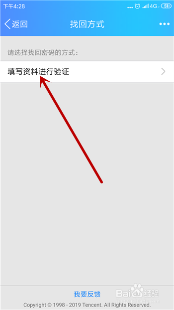 然后需要选择找回密码的体例,点击【填写资料进行验证】。