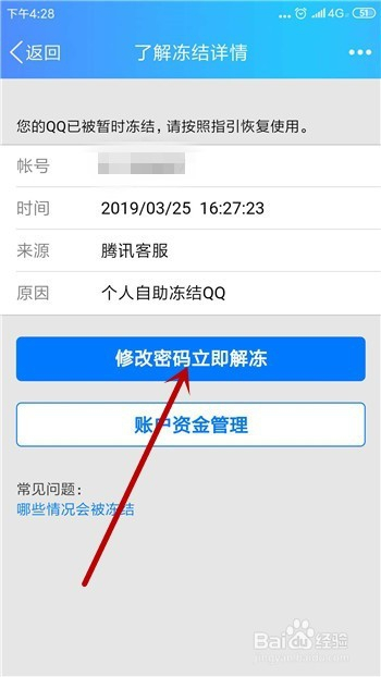 接下来会显示我们账号被冻结的环境,点击【点窜密码当即解冻】。