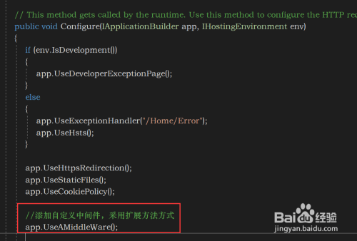 在Startup.cs中的Configure方式中进行自界说中心件的添加,如下图所示: