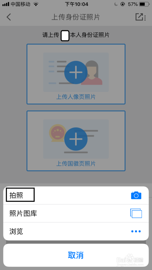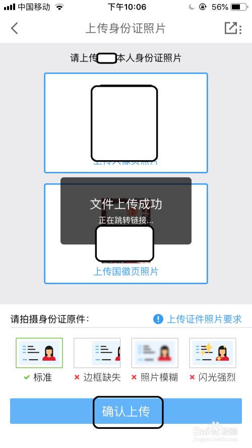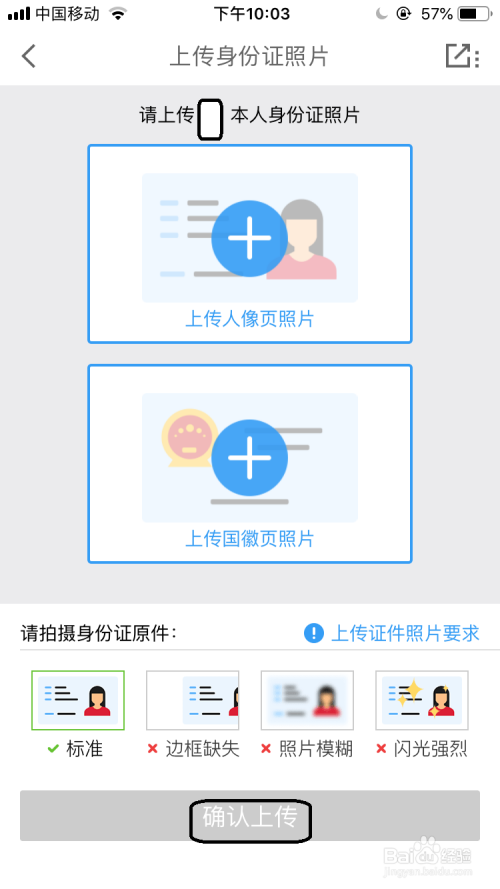 切换到上传身份证照片的界面中点击该要求的信息区中,若是没怀孕份证照片可心选择“摄影”选项进行摄影后把身份证上传后再在界面点击“确认上传”。