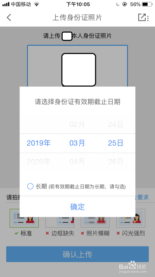 然后弹出请选择身份证有用期截止日期的提醒中调整身份证的有用期后再点击“确定”。