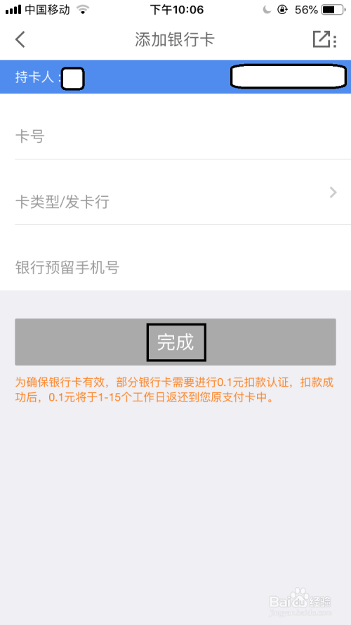 然后切换到添加银行卡的界面中输入银行卡的卡号后再点击“完当作”。
