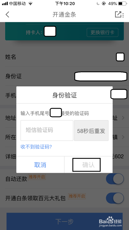 在这可以开通白条的功能了,界面中找到“”选项并选择开启(图1),随后信息确认无误后再点击“下一步”*(图2)。