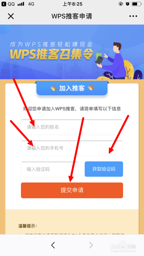 填入 本身的姓名 、手机号 以及 获取的短信验证码,最后点击 提交申请 。