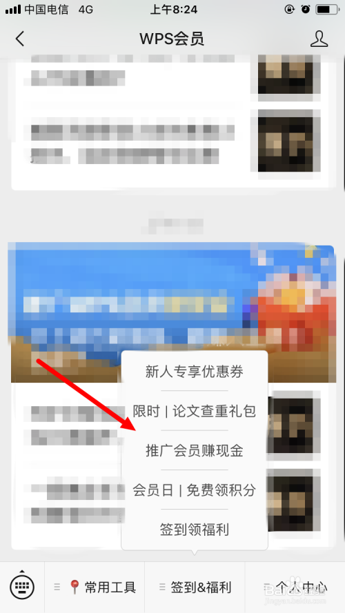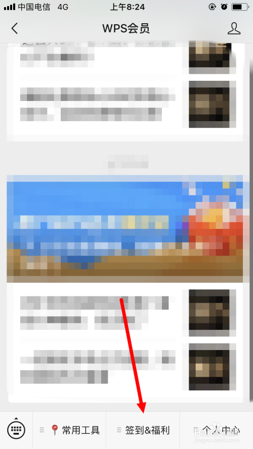 首先我们要在微信上存眷WPS的公家号,然后进入WPS微信公家号,点击菜单栏里面的 签到 福利 。