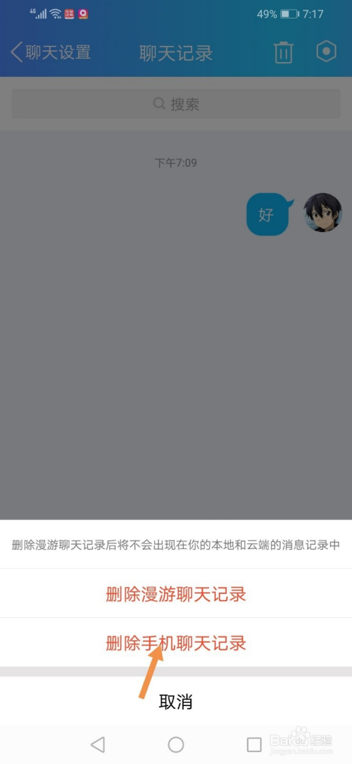 点击删除图标后,点击删除手机聊天记实,接着点击确定,你与老友的聊天记实就删除了。