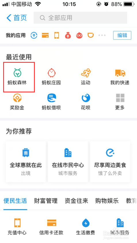 接着我们在比来利用选项下找到并点击蚂蚁丛林,如图所示;