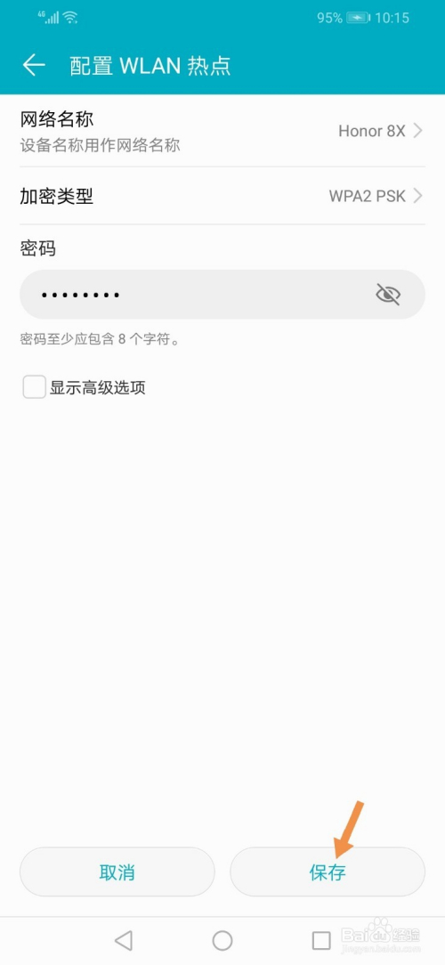 在设置装备摆设WLAN热点界面,先将密码删除,接着输入新密码,然后点击保留。