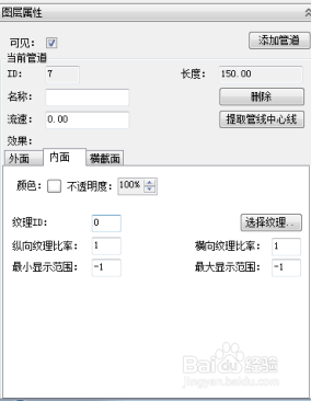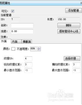 管道参数在图层属性下外面、内面、横截面三个节制面板内进行设置,此中显示由外面和内面两个面板中颜色、透明度、纹理、纹理比率(米)及显示规模(米)参数来节制, 输入参数据后回车确认;规格、尺寸及偏移设置由横截面面板内进行参数设置(单元均为米), 输入参数后点击 “ 应用 ” 确认,如下图所示: