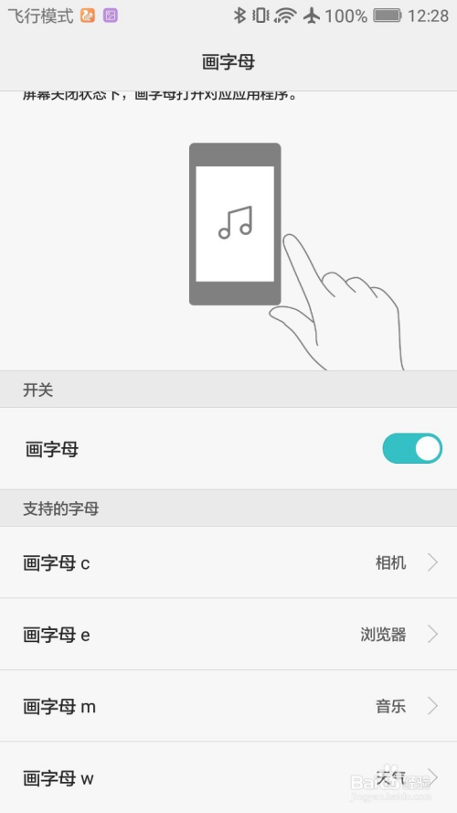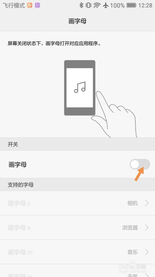 在画字母界面,点击开关里画字母右边的灰色区域。画字母打开后,你就可以点击撑持的字母下面4个字母,设置你想要经由过程画字母打开的应用程序。