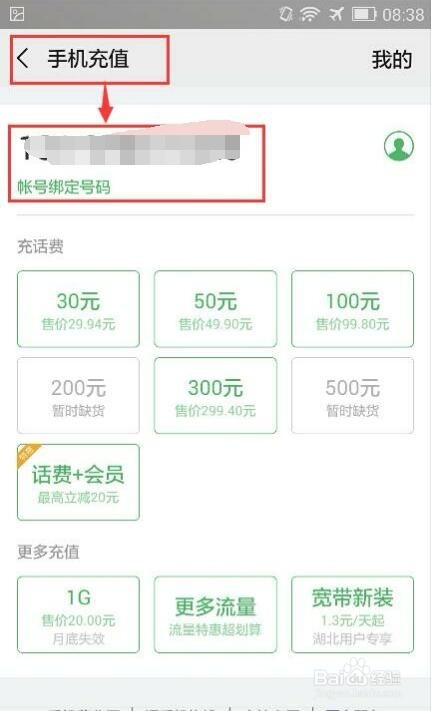 进入手机充值页面后,会呈现帐号绑定号码,若是以前帮别人充过话费,此刻要给本身充,那就要切换为账号绑定号码;