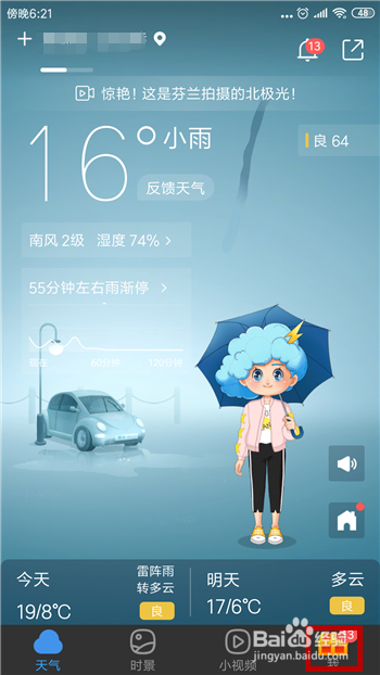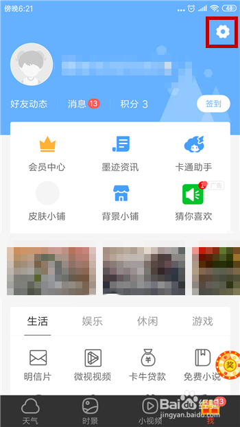 接着在墨迹气候的小我本家儿页里点击右上角的【设置】。