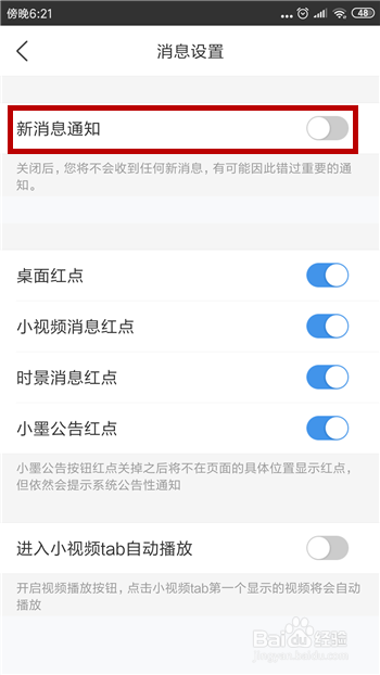 在动静设置里若是想封闭所有的动静提醒则点击【新动静通知】后方的开关。
