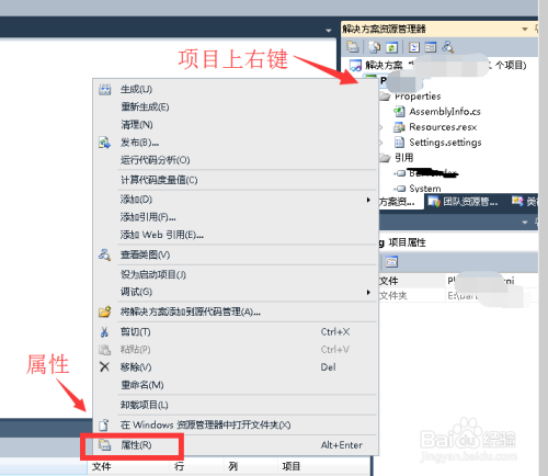 打开项目解决方案,在代码编写界面右边的解决方案下面的项目名上点击鼠标右键,选择属性。