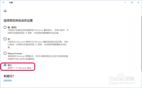 再进入Windows 设置,将 选择预览体验当作员设置 为【跳过-跳到下一Windows版本】;