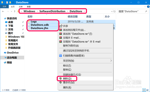 ❷ 进入系统盘C:\Windows\SoftwareDistribution,删除 DataStore 和Download文件夹中的所有文件;