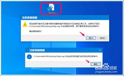 ❹ 在系统桌面上左键双击【Skip.reg】注册表文件图标,在弹出的注册表编纂器对话框中,先后点击:是(Y)和确定。
