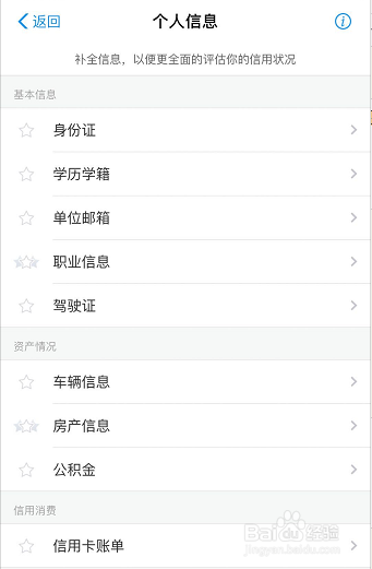然后在小我信息本家儿页下,点进一项一项的小我信息进行填写完美,如图所示!完美小我信息是晋升芝麻信用分的简单有用方式之一呢!