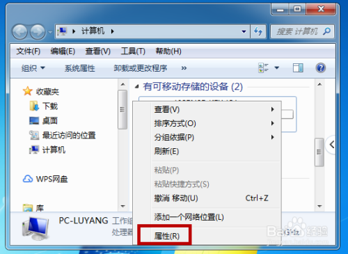 把U盘插到电脑的USB接口,鼠标右击U盘,点击【属性】。
