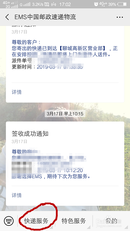 我们进入公家号后,我们点击下方的快递办事。选择我要查询,如下图所示。