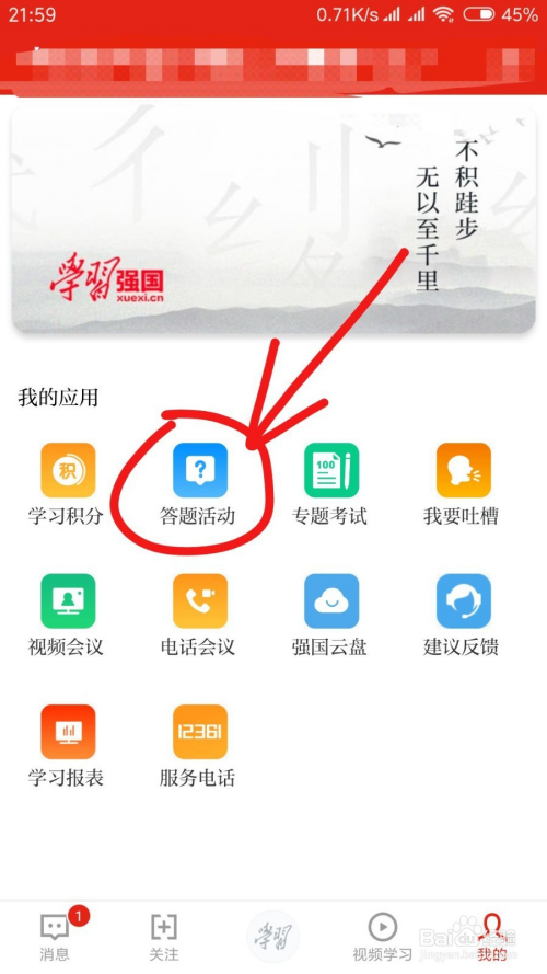 我们打开我们的学习强国之后,我们可以在我的界面找到答题活动,然后点击。
