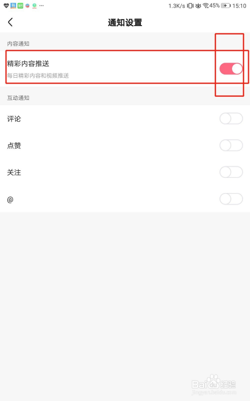 第六步,我们点击接管内容推送后面的按钮,就可以当作功地把皮皮虾的动静通知封闭了,如图所示。