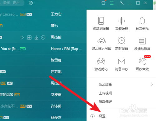 毗连当作功后,我们打开电脑的QQ音乐,点击上方三个横的图标,然后选择设置进入。
