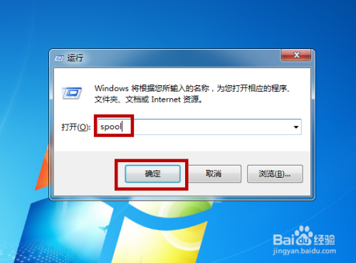 同时按下电脑键盘的【windows】+【R】,打开运行界面后输入【spool】并点击【确定】。