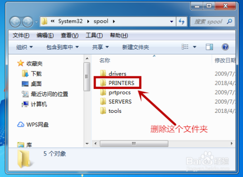 打开打印机文件夹后找到【PRINTERS】文件夹,鼠标右击并点击删除这个文件夹。