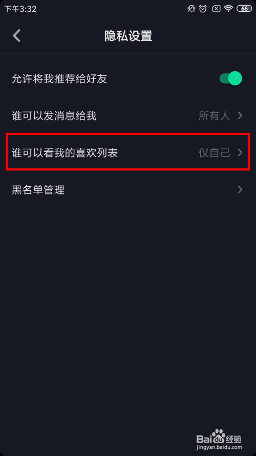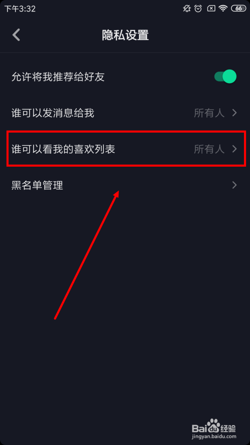 在隐私设置中,找到第三条【谁可以看我的喜好列表】,如下图所示。