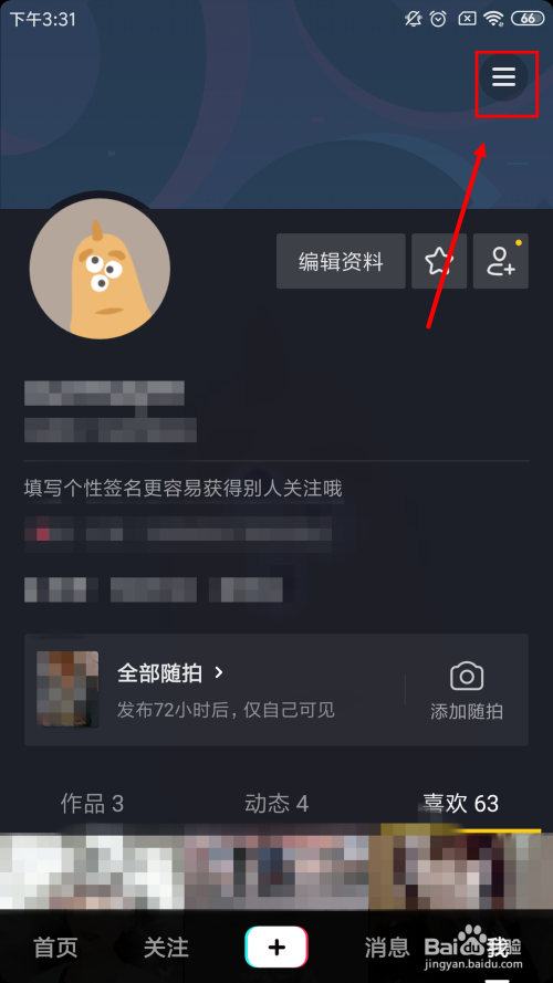 点击小我本家儿页右上角的三条线按钮,就会有个小菜单弹出,如下图所示。