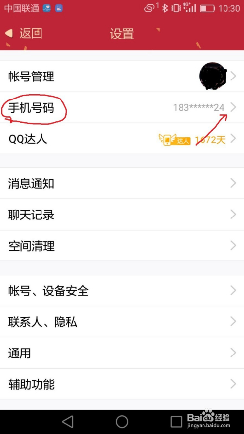 在弹出的设置界面中,选择“手机号码”选项,点击右边的箭头,如图中红色标识表记标帜;