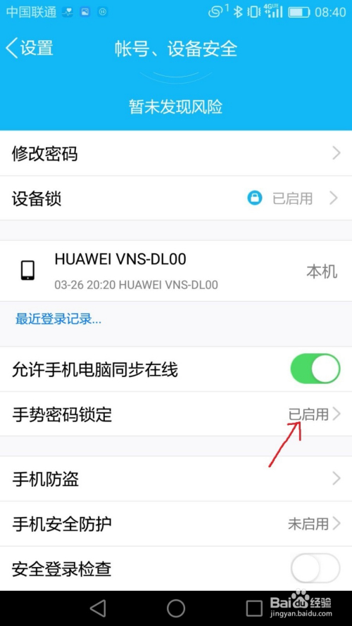 当绘制完两次解锁图案后,返回到账号、设备平安界面,可以看到手势密码锁定已启用,如箭头所示,这样我们就开启手势密码登录QQ的功能了。