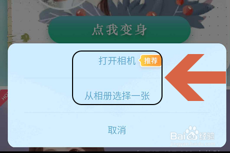 那么接下来要如何变身呢?点击“点我变身”这一项,然后页面下方就会弹出要求我们打开相机或者上传照片的窗口,见图二;