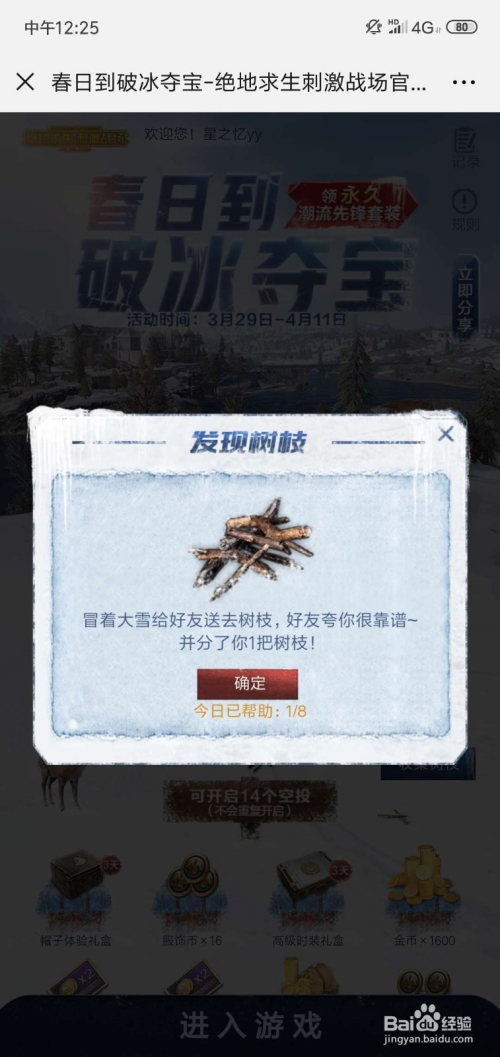 当老友点开你的活动,就能收到对方赠予的1捆树枝,反之,我们点开老友分享的链接,能帮忙老友找到树枝1次;