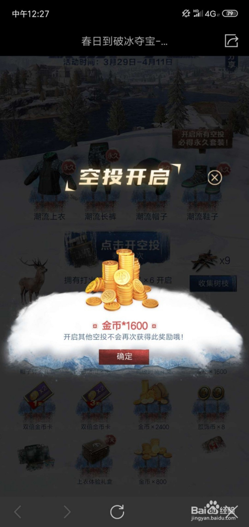 回到游戏首页的“邮箱”,我能点击【春日到破冰夺宝】领取奖励,要想获得前锋潮水套装,我们就需要打开14个空投包。