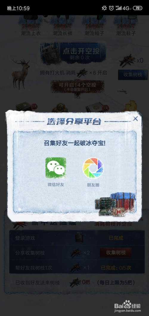 我们登岸游戏即可获取一只打火机,点击“收集树枝”,将活动分享给老友,我们就能获得2捆树枝;